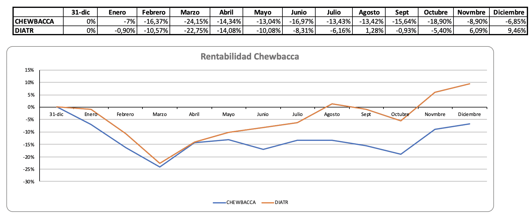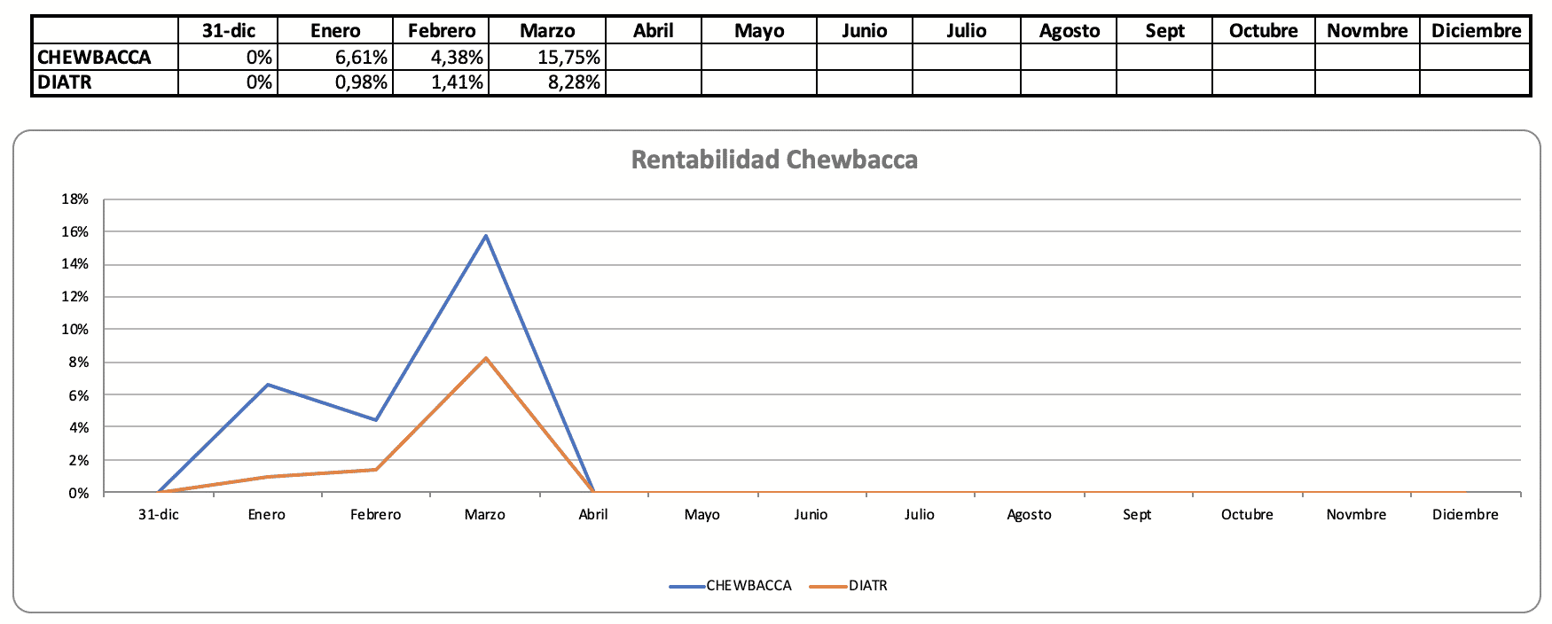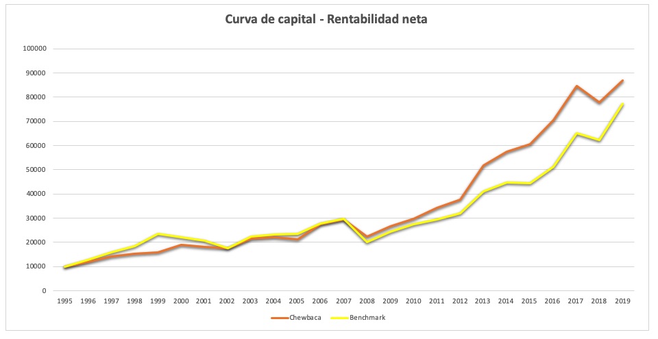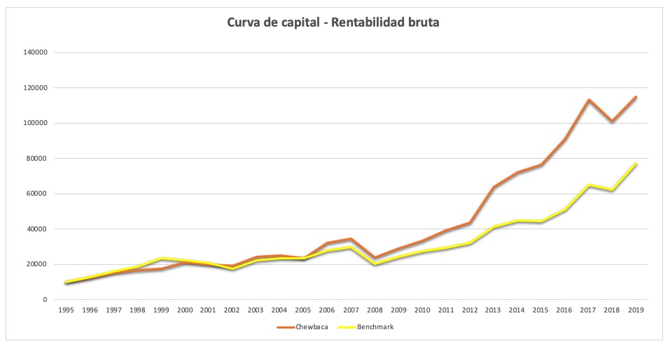 Así que, pese a utilizar elementos en mi contra que no debería utilizar (total exención de impuestos en el benchmark, rendimiento irreplicable y cálculo de impuestos «a lo bruto» en Chewbacca) sigue mejorando notablemente el resultado del índice.