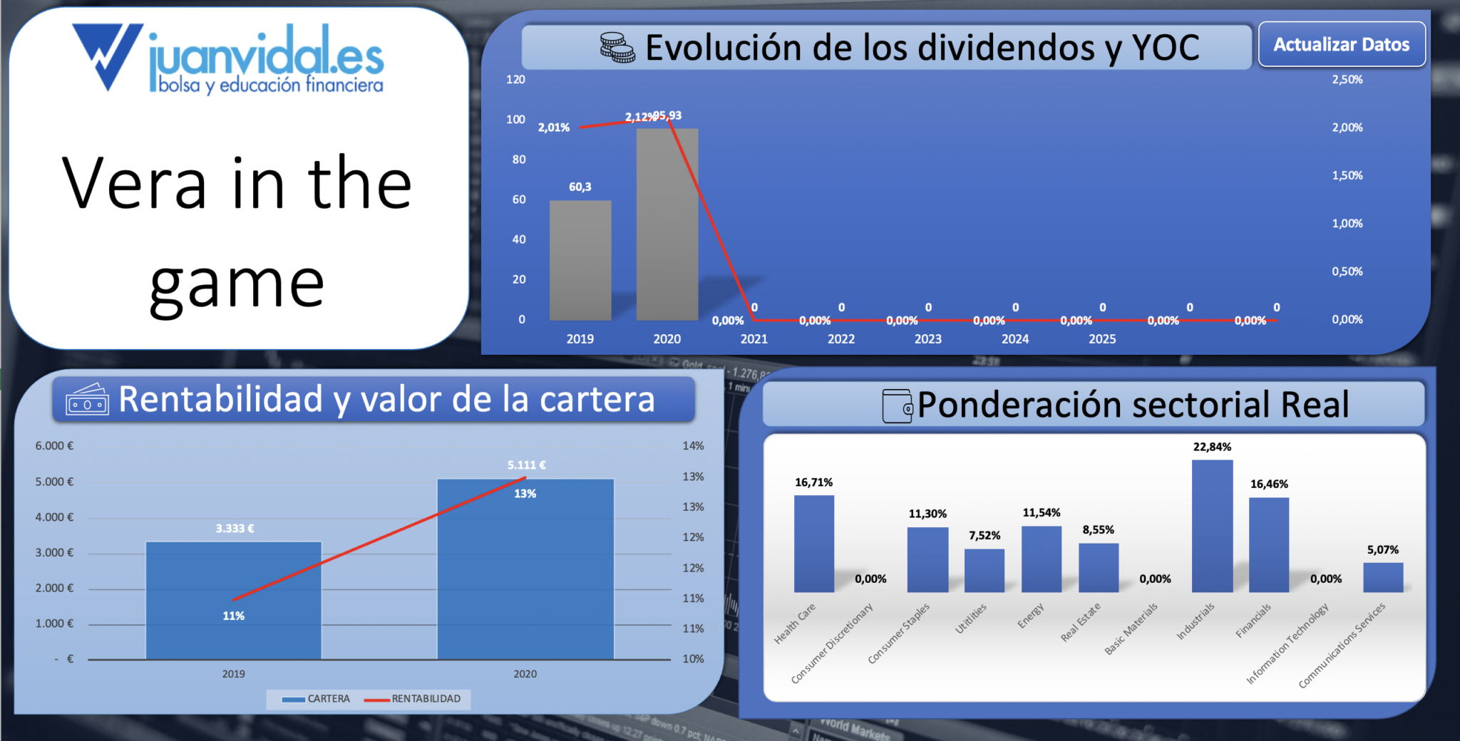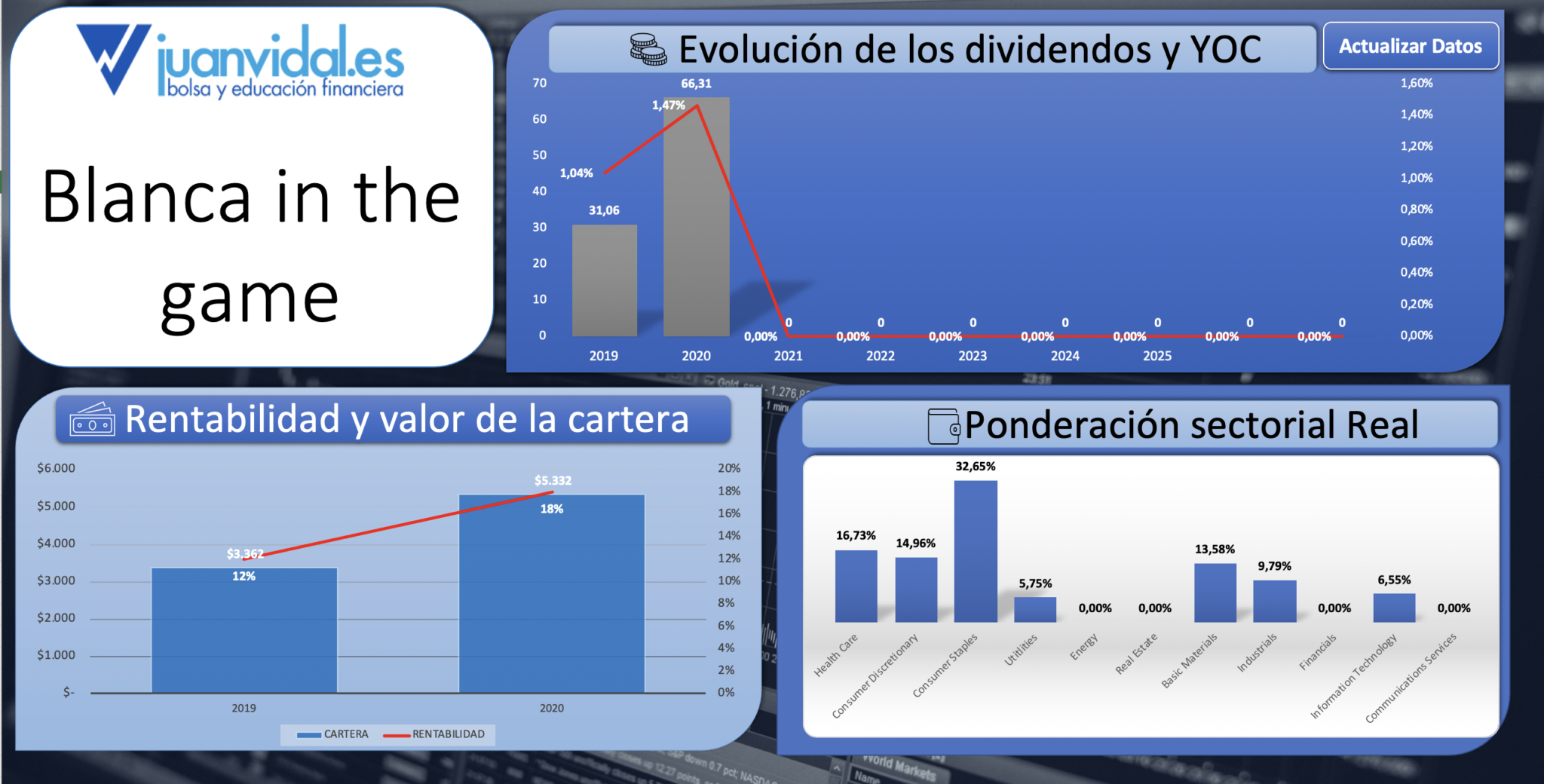 En cuanto a dividendos, Vera ha recibido la paga de T, GD, ABBV, PBCT y CAT y Blanca le han dado la paga APD, ABT, CL y PG.